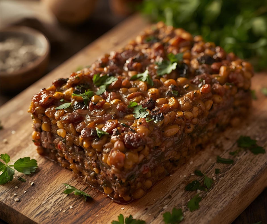 Add to the lentil mixture, the mushrooms, breadcrumbs, cheese, pepper and herbs. Bind in the beaten eggs and lemon juice. Smooth into the prepared tin and bake for about one hour.